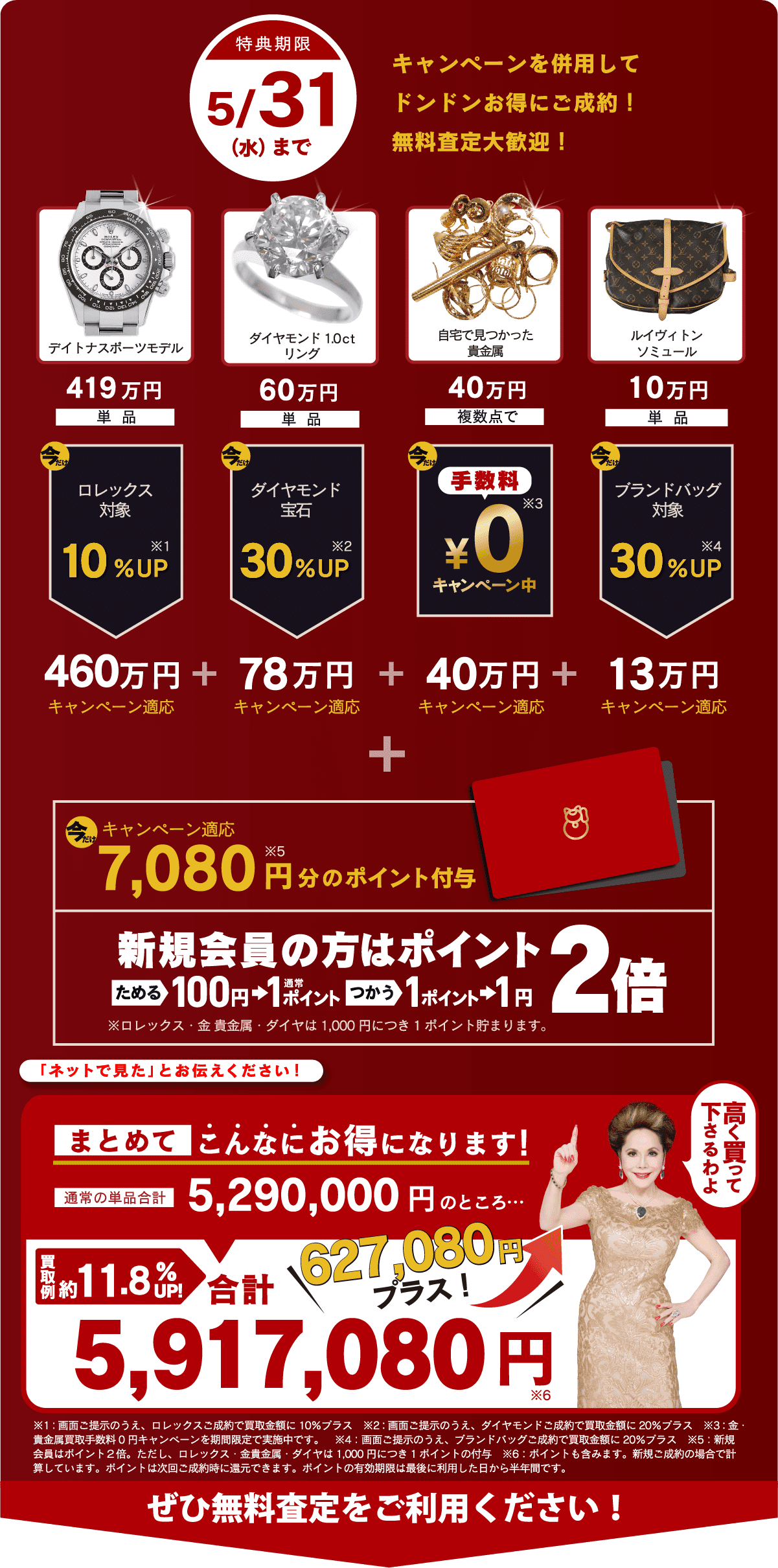 査定料、送料(宅配買取)、出張費(出張買取)、振込手数料、キャンセル手数料などは一切頂いておりませんのでご安心ください。