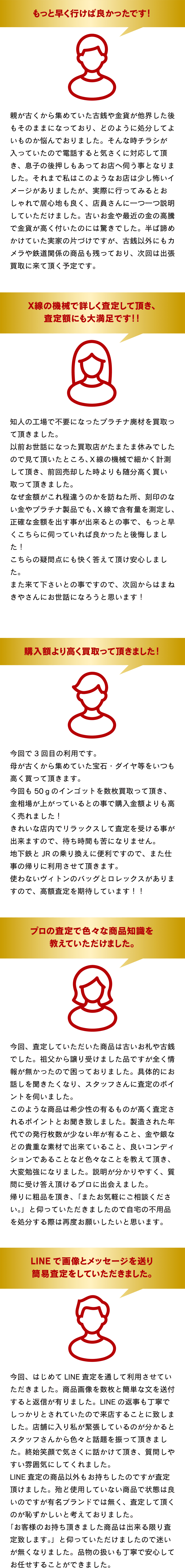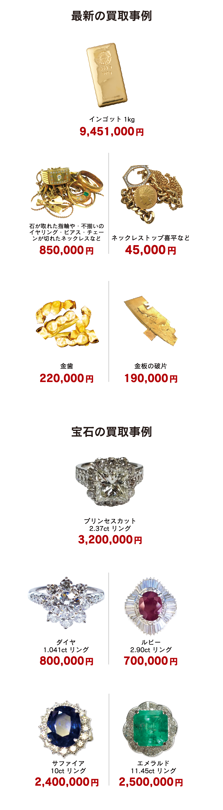 金、プラチナ、宝石、ブランド品(時計、バック、アパレルなど)など新品は勿論、中古品や壊れたお品物もお買取りしております。 できる限り多くの商品をお買取りしておりますので、お気軽にご相談ください。意外な商品に値打ちがある場合もございますのでお気軽にお問合せください。